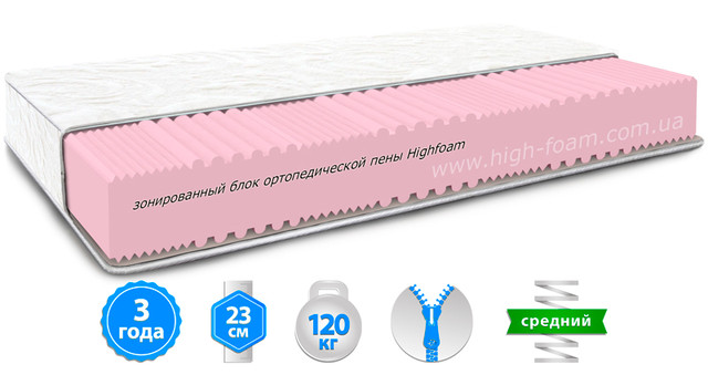 Піна Highfoam - це пінополіуретан, екологічно чистий матеріал, що забезпечує комфортне і природне положення тіла людини при лежанні. Головна перевага матеріалу полягає в його комірчастої структурі, яка, з одного боку рівномірно розподіляє навантаження, а з іншого - має хороші показники повітропроникності.